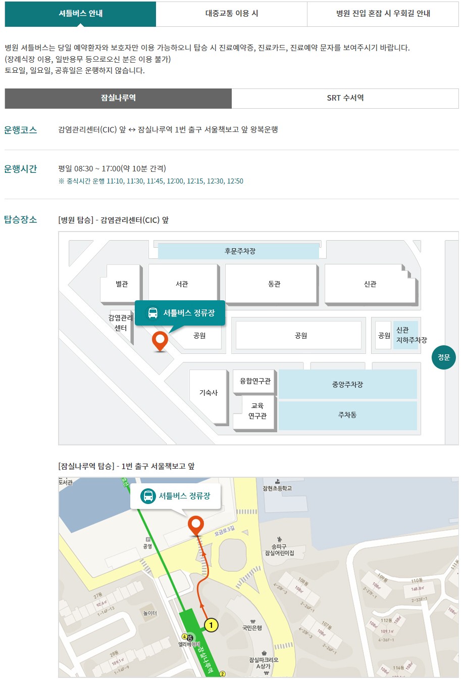 특히 잠실나루역과 SRT 수서역을 오가는 셔틀버스가 운영되고 있어, 병원을 방문하는 분들에게 큰 도움이 됩니다.